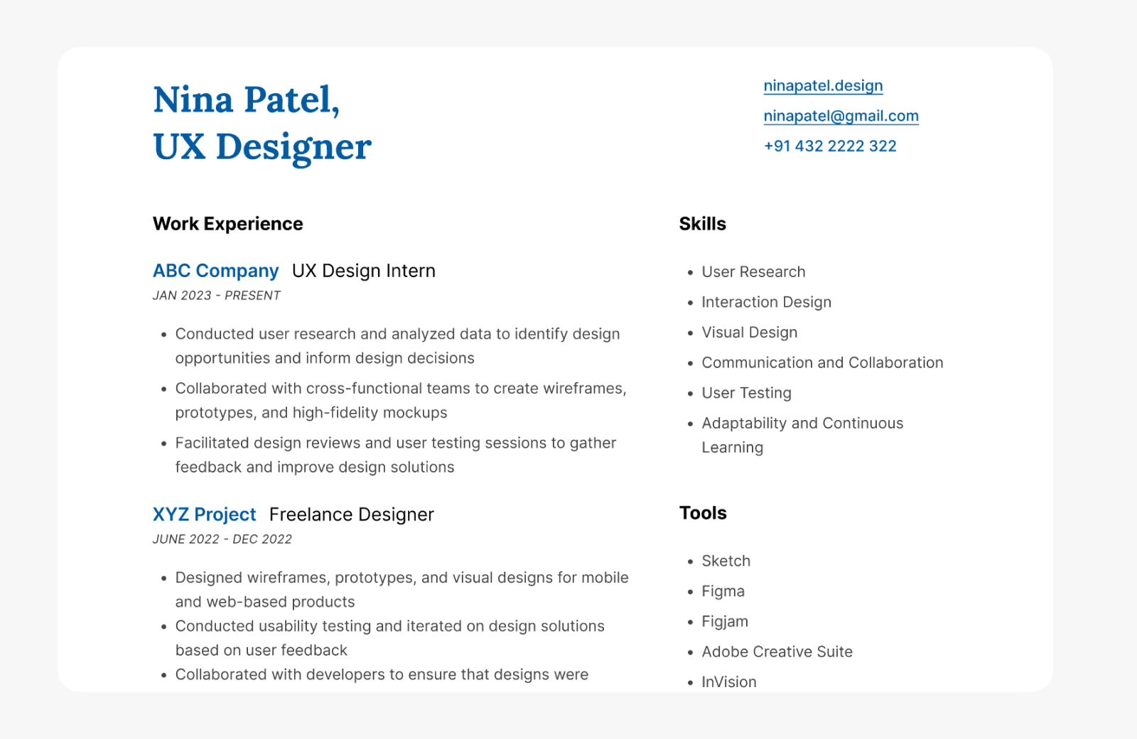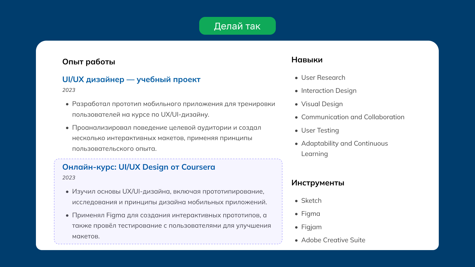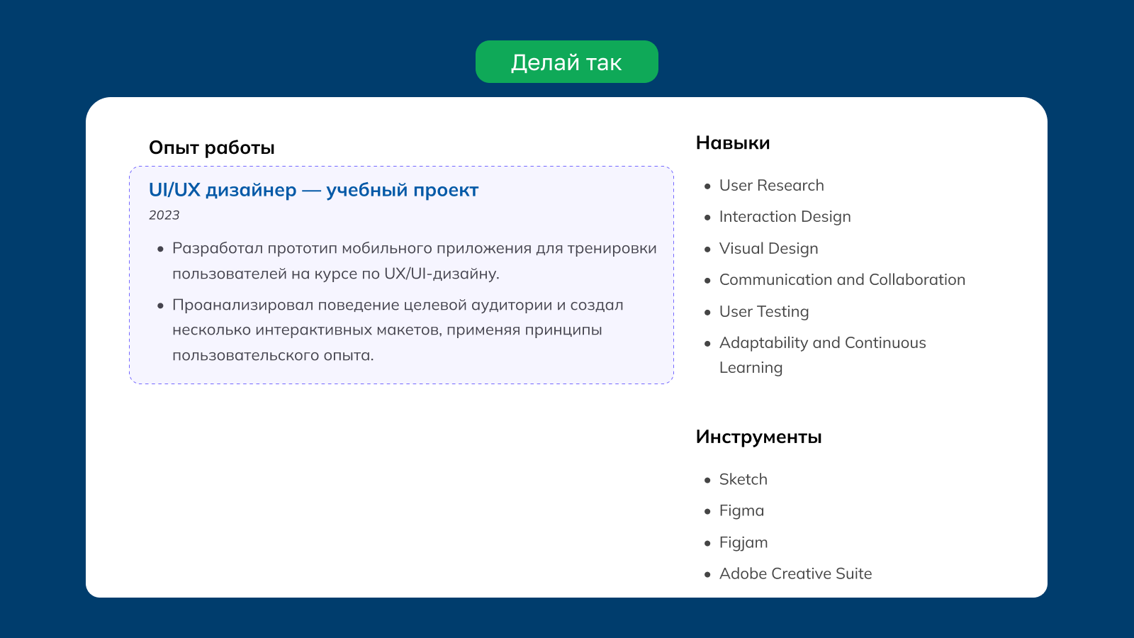 Почему это работает: даже если это учебные проекты, они показывают ваши навыки и знания. Опишите задачи и процессы, которые вы проходили: анализ, прототипирование, тестирование и разработка интерфейсов.