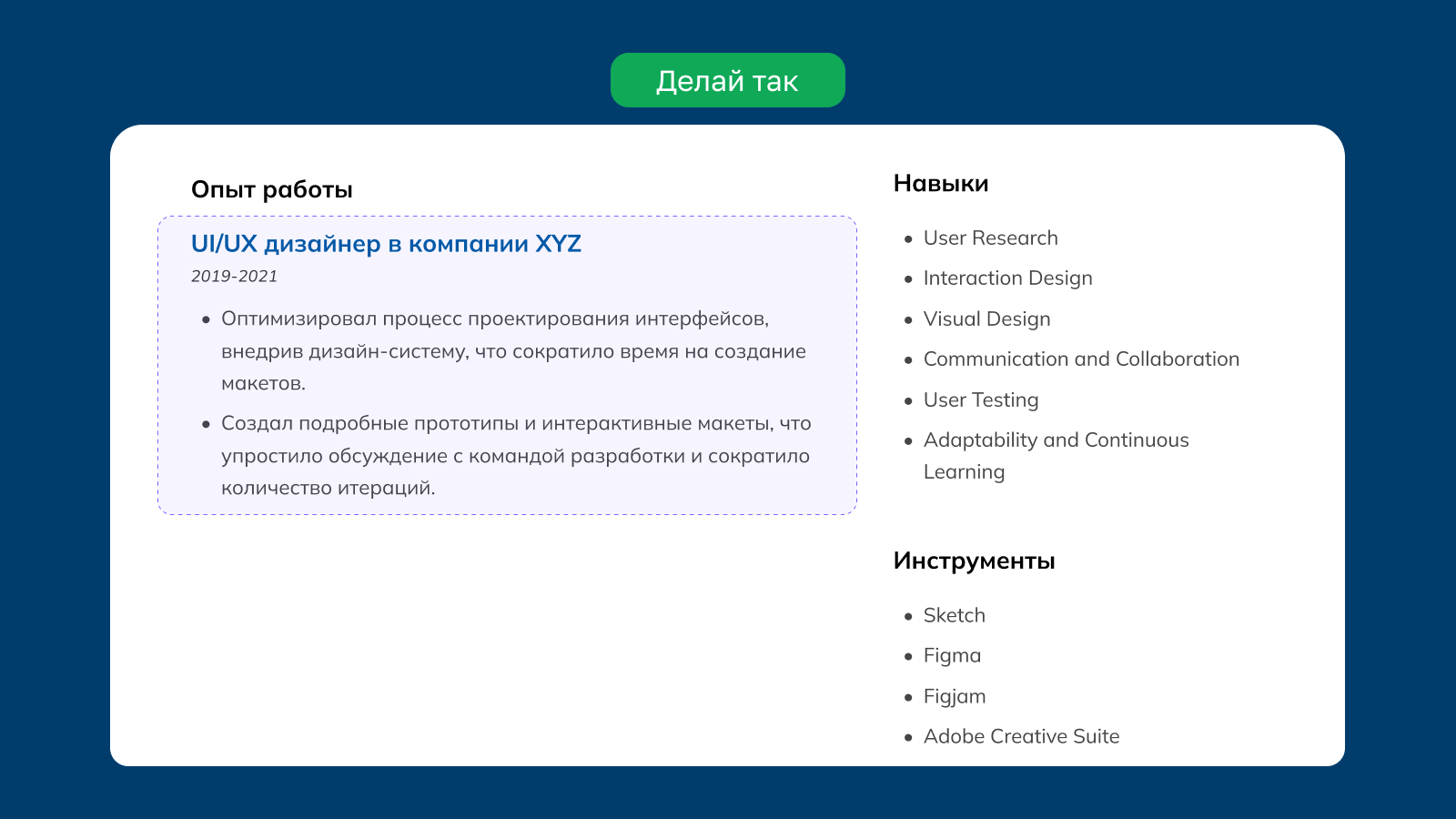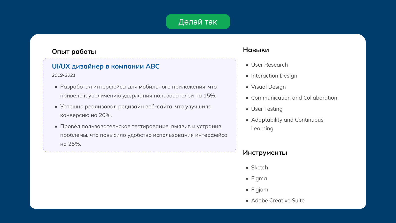 Фокусируйтесь на достижениях, а не только на обязанностях. Работодатели хотят видеть, как ваша работа привела к реальным результатам. Описание обязанностей даёт общее представление, но достижение конкретных целей и улучшение показателей делают вас более ценным кандидатом.