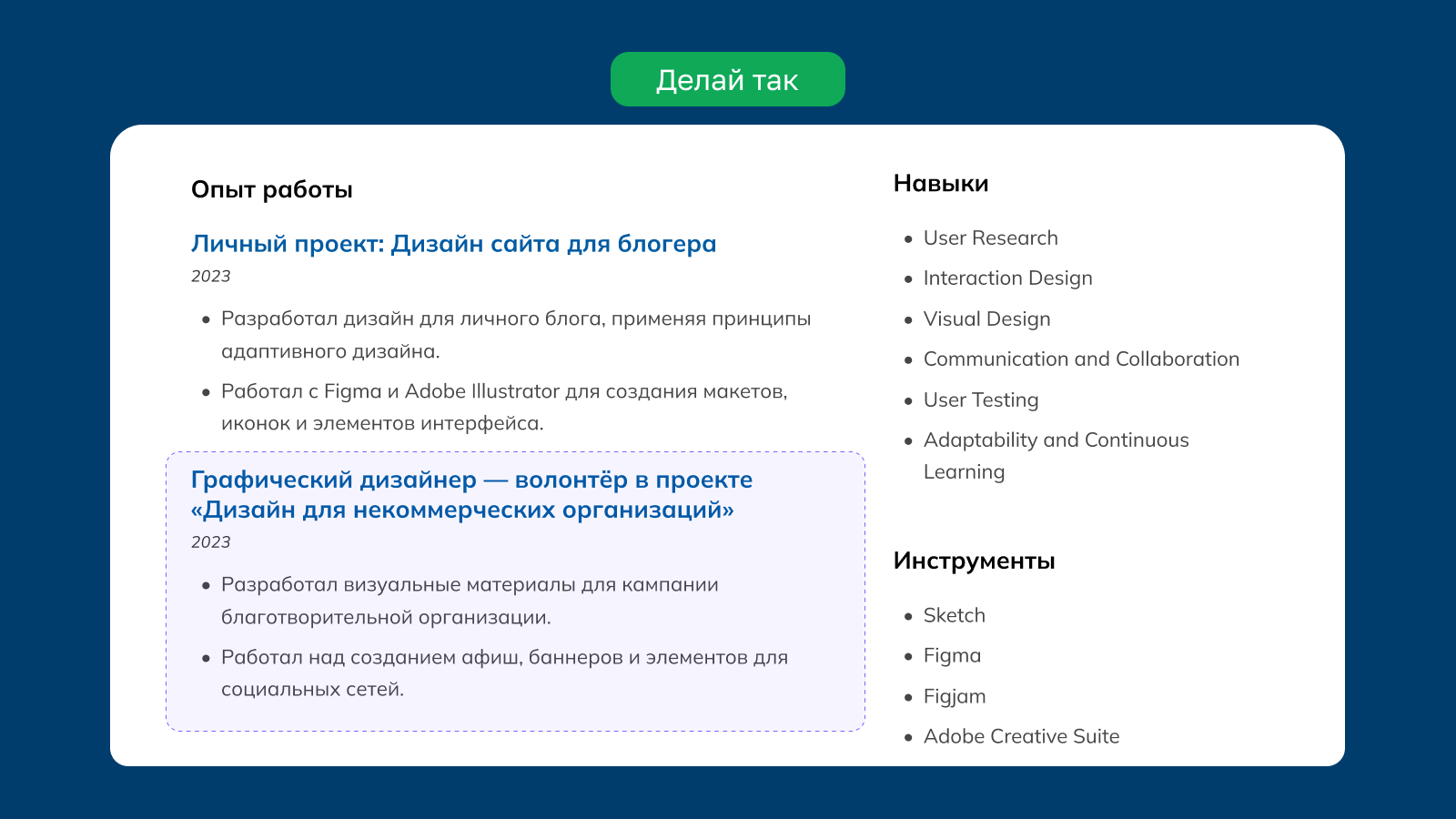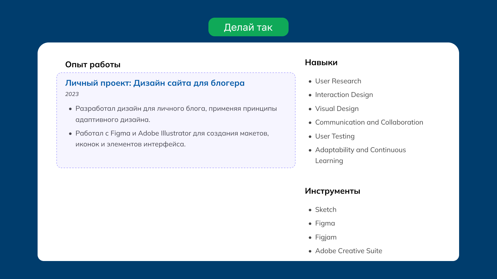 Почему это работает: если у вас пока нет профессионального опыта, личные проекты — это отличный способ показать свои способности и инициативность.