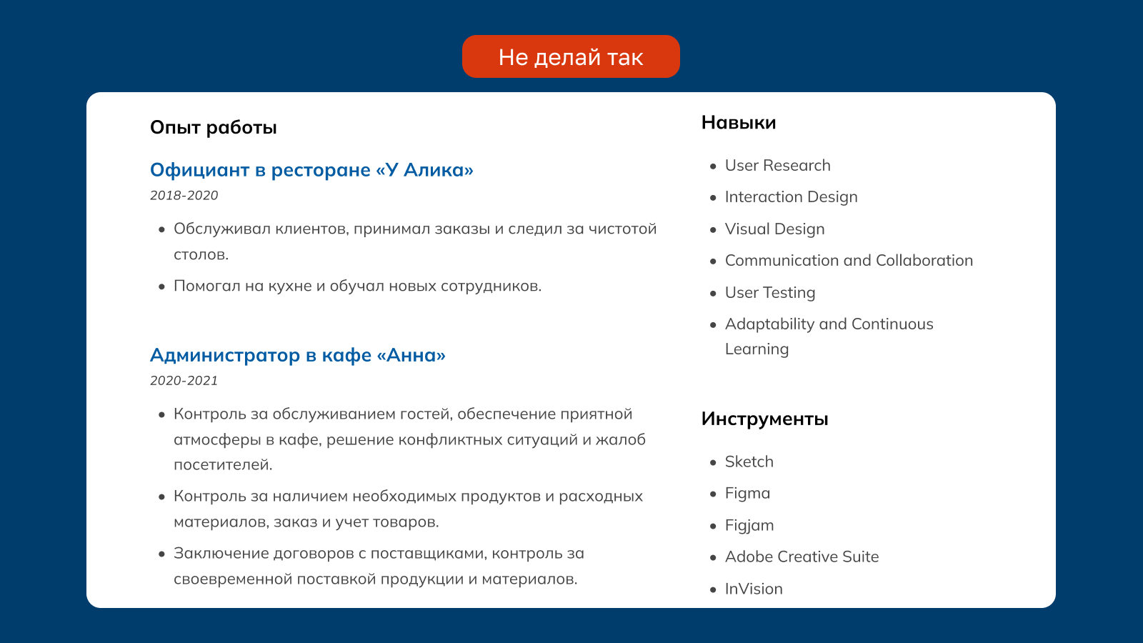 Почему это нерелевантно: опыт работы официантом не связан с навыками дизайна и не показывает ваши способности в графическом или UX/UI-дизайне. Хотя эта работа могла развить вашу коммуникацию и командную работу, она не добавляет ценности в контексте позиции дизайнера.