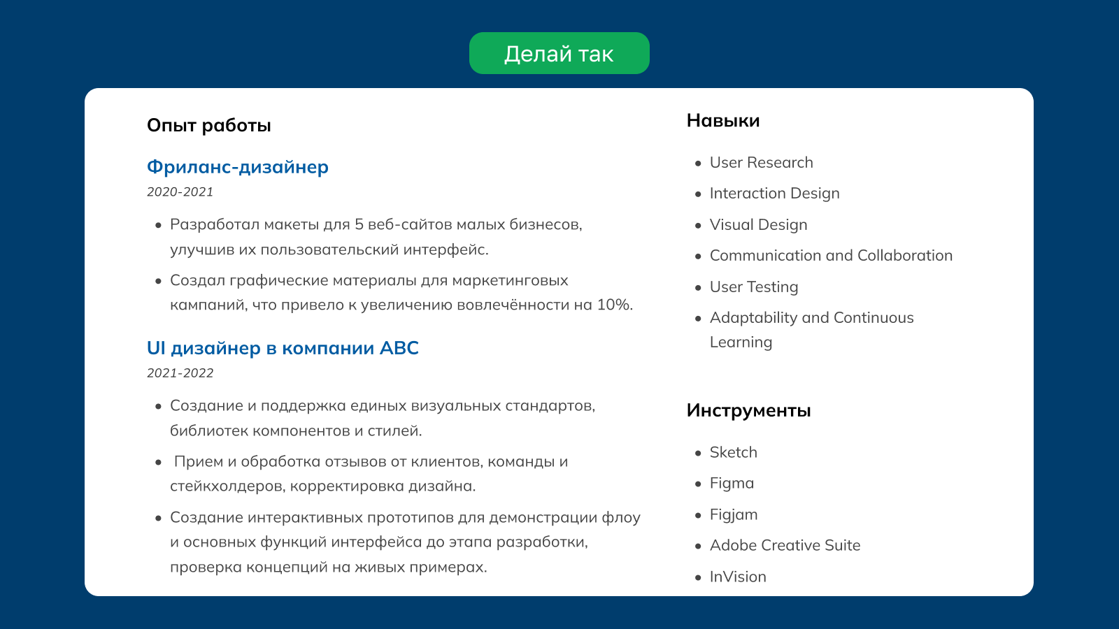 Не добавляйте в резюме опыт, который не связан с вакансией. Вам может показаться, что это как-то косвенно поможет, но это не так. Если опыт работы, который у вас был, не демонстрирует навыки, важные для позиции дизайнера — не вставляйте его.