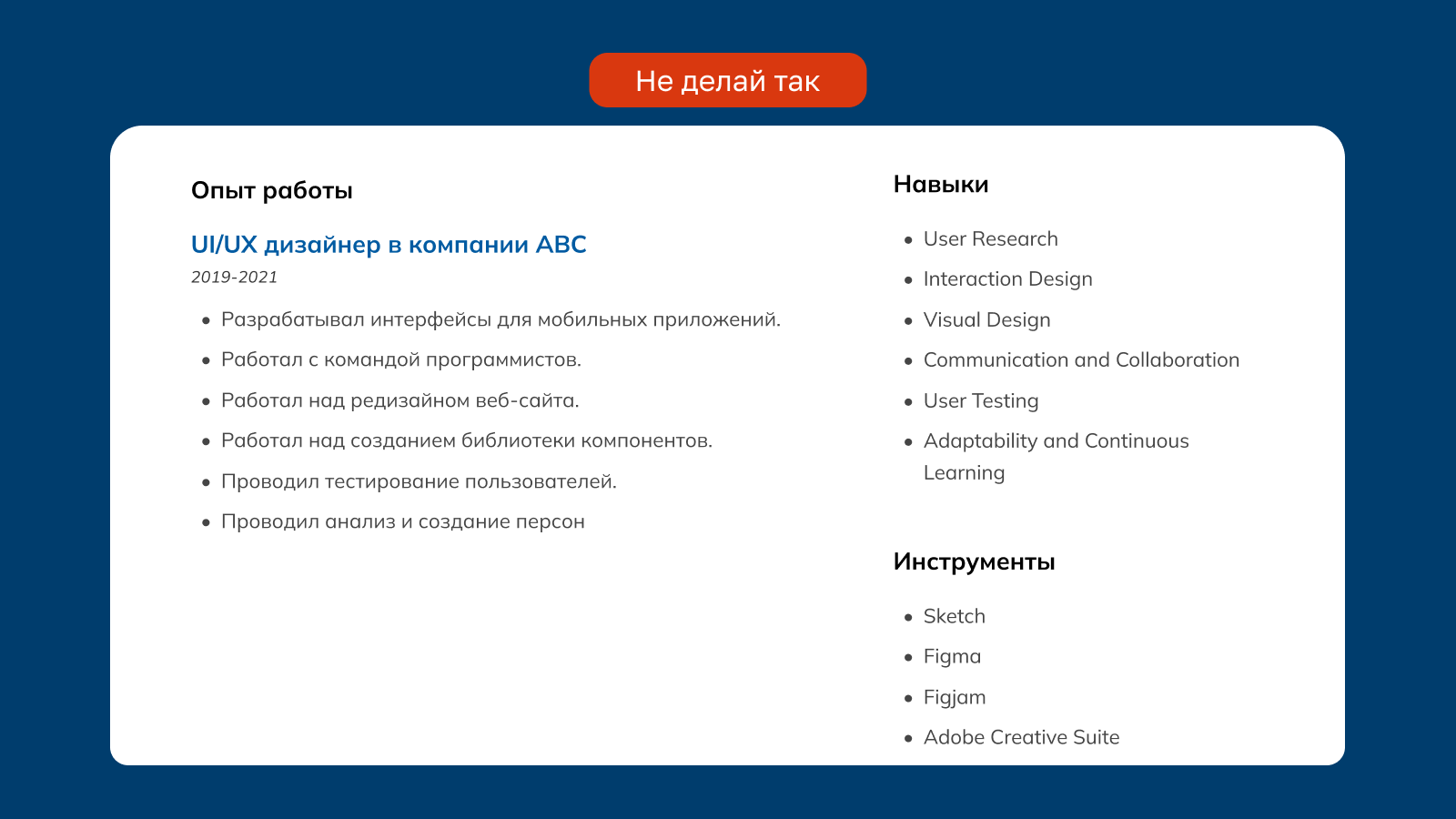 Как исправить: если хотите подчеркнуть свои soft skills, лучше это сделать в другом контексте, без акцента на нерелевантную работу. Например, включите фриланс-проекты или стажировки, даже если они были небольшими, но относятся к дизайну.