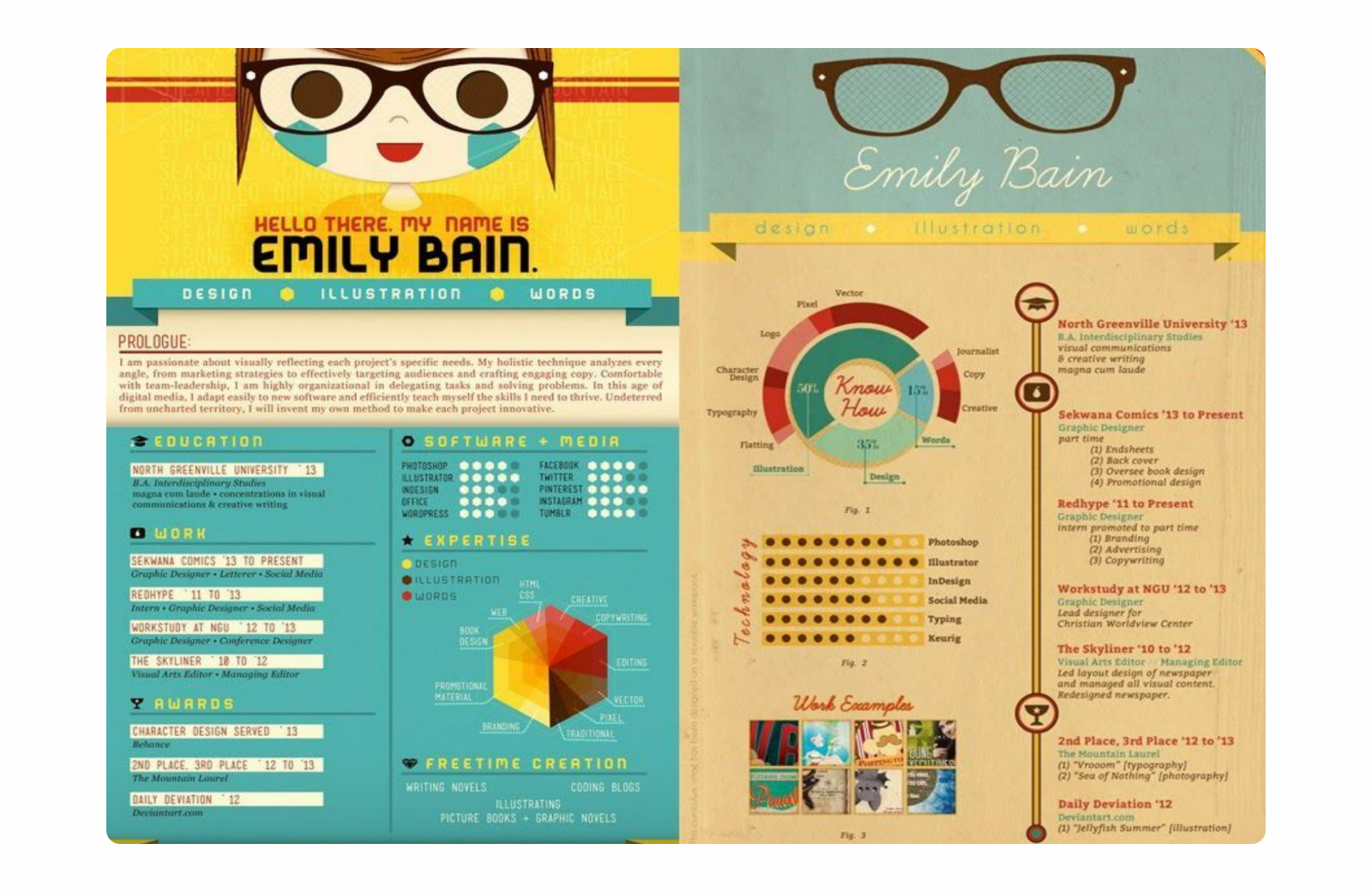 Резюме выполнено в виде яркой инфографики с большим количеством визуальных элементов, но содержит мало текста и конкретных фактов. Используются нестандартные шрифты, цветовые схемы и минималистичная информация.