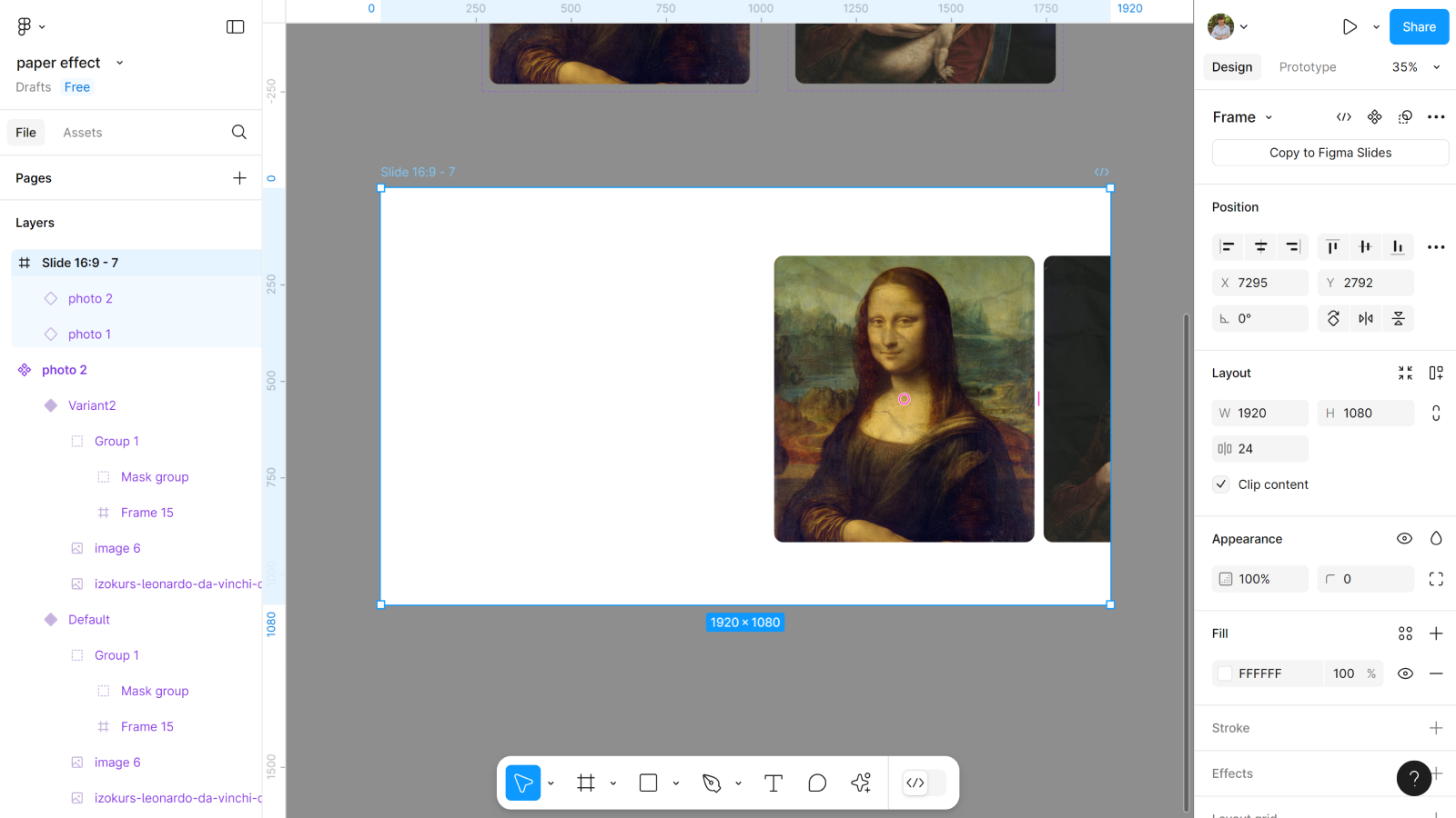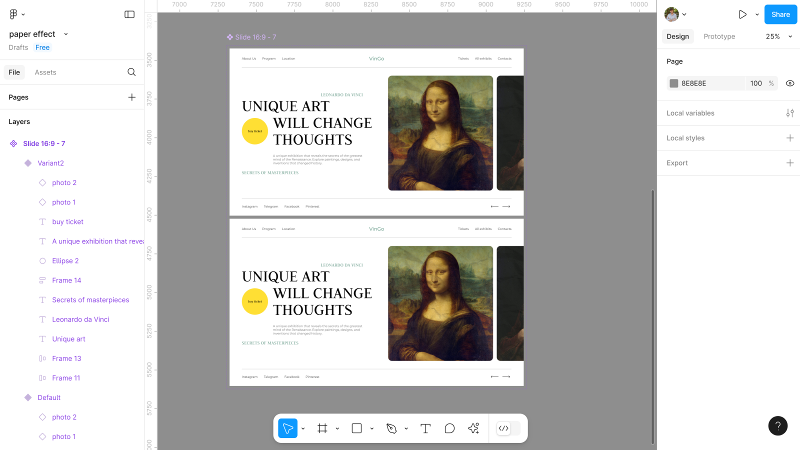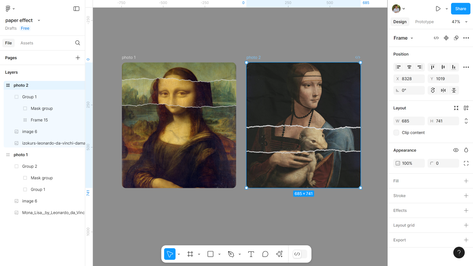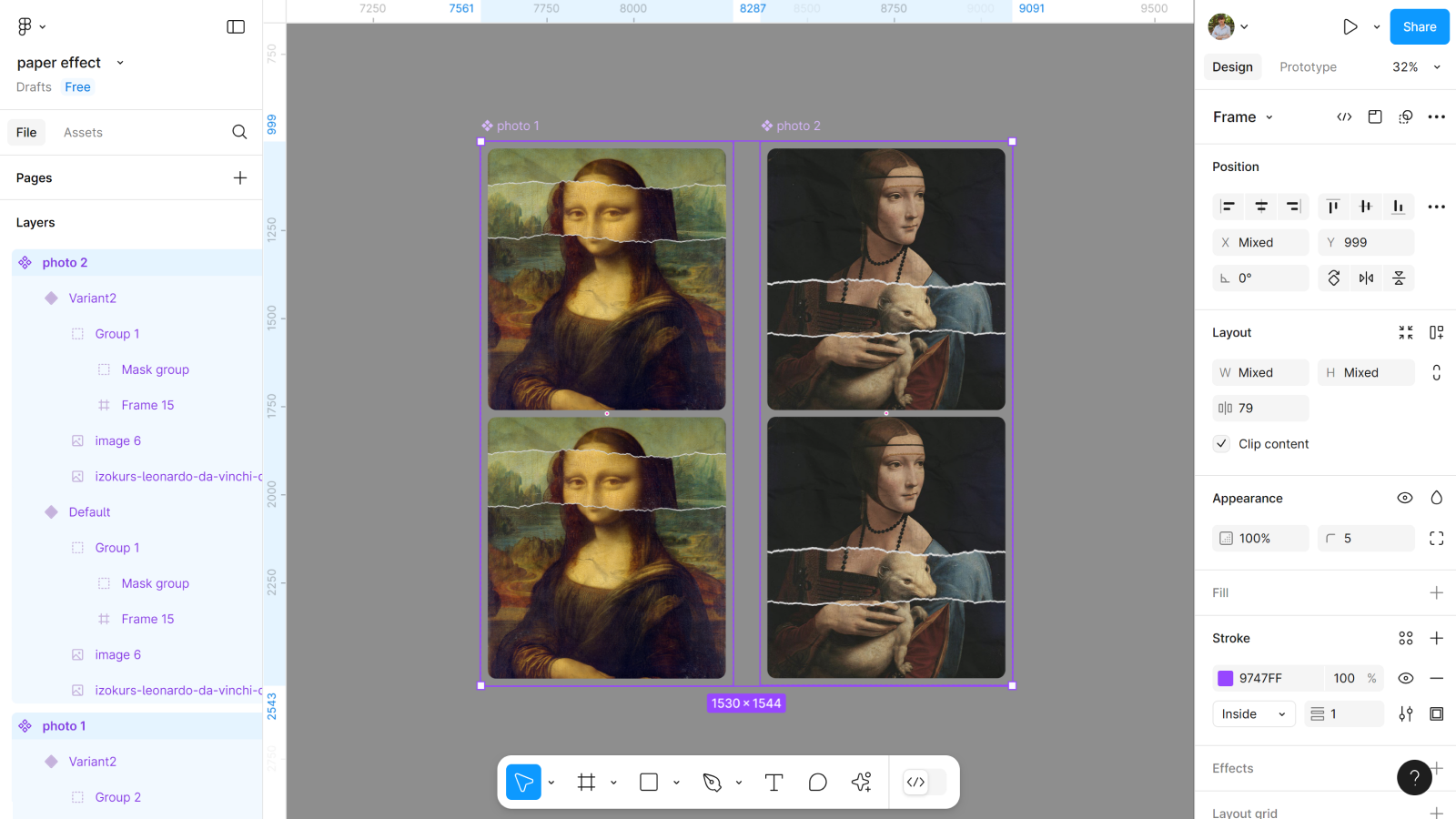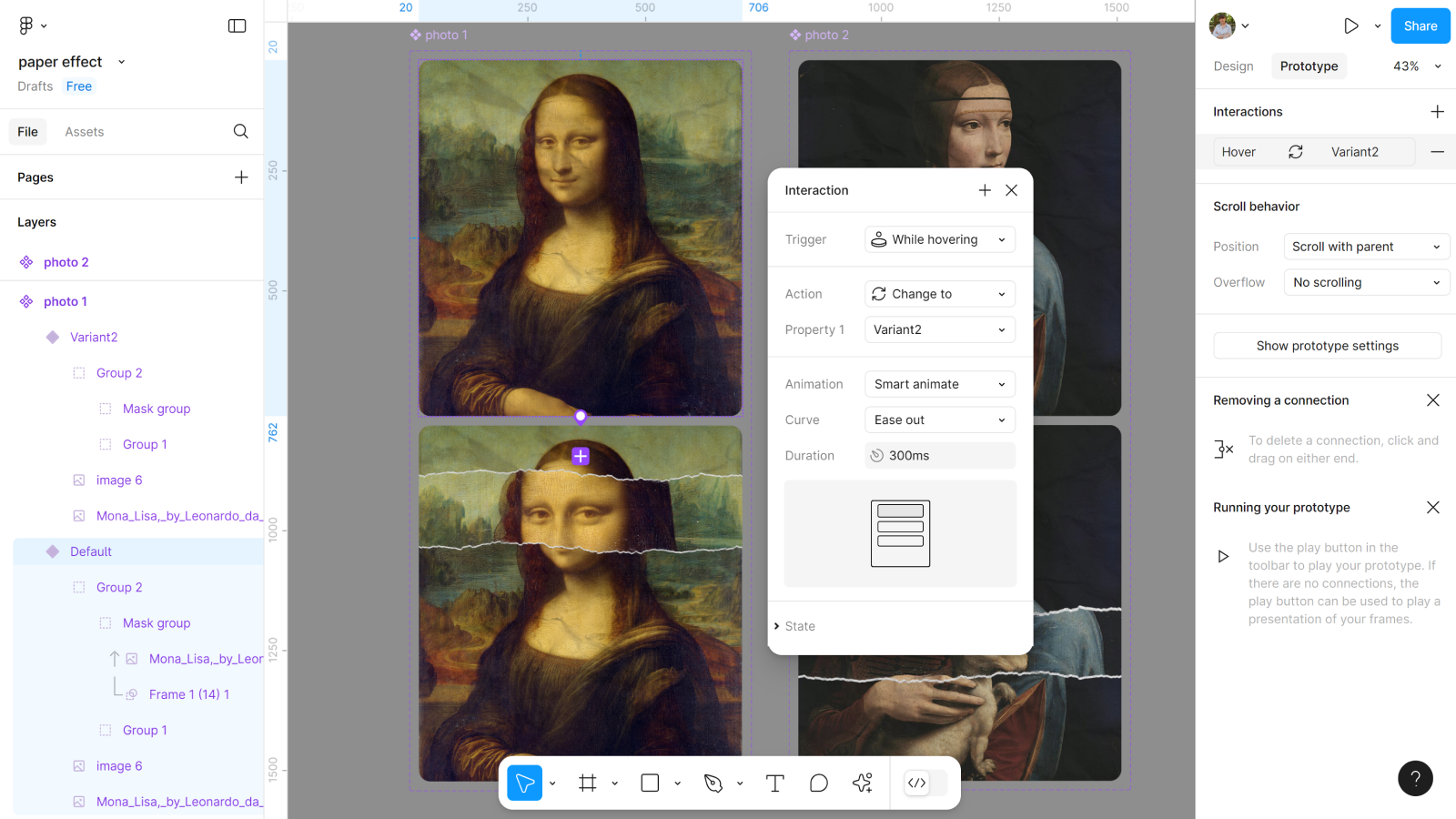 Поскольку мы хотим, чтобы наш интерфейс был эффектным и соответствовал принципам эстетики, анимация тут будет очень кстати. Я хочу, чтобы рваные края бумаги появлялись при ховере на фото. Чтобы быстро это настроить, нам нужно создать компонент с вариантом для наших фото.