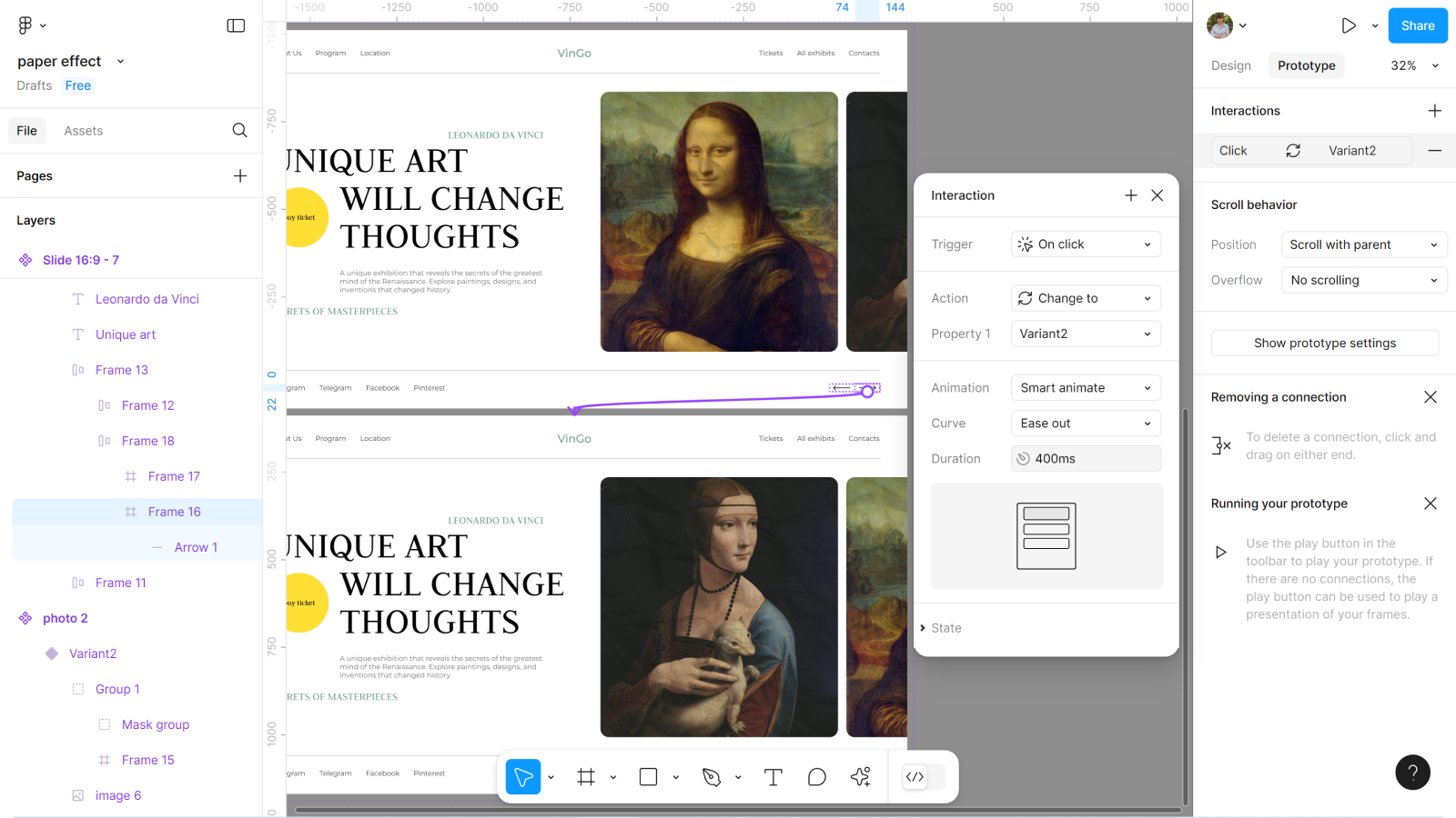 - С иконки стрелки вправо первого варианта выбираем триггер On click, с анимацией Smart Animate и скоростью 400ms.